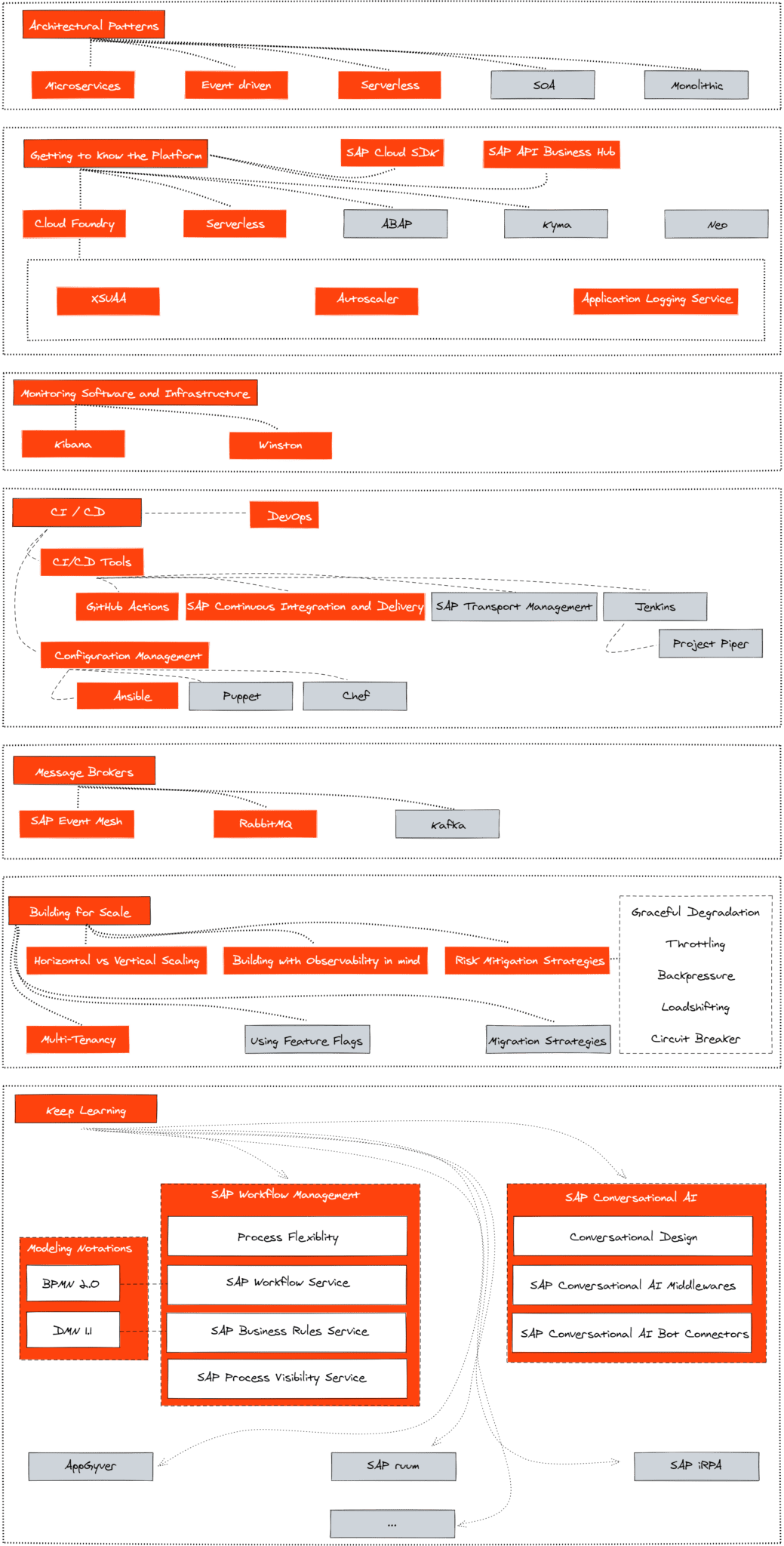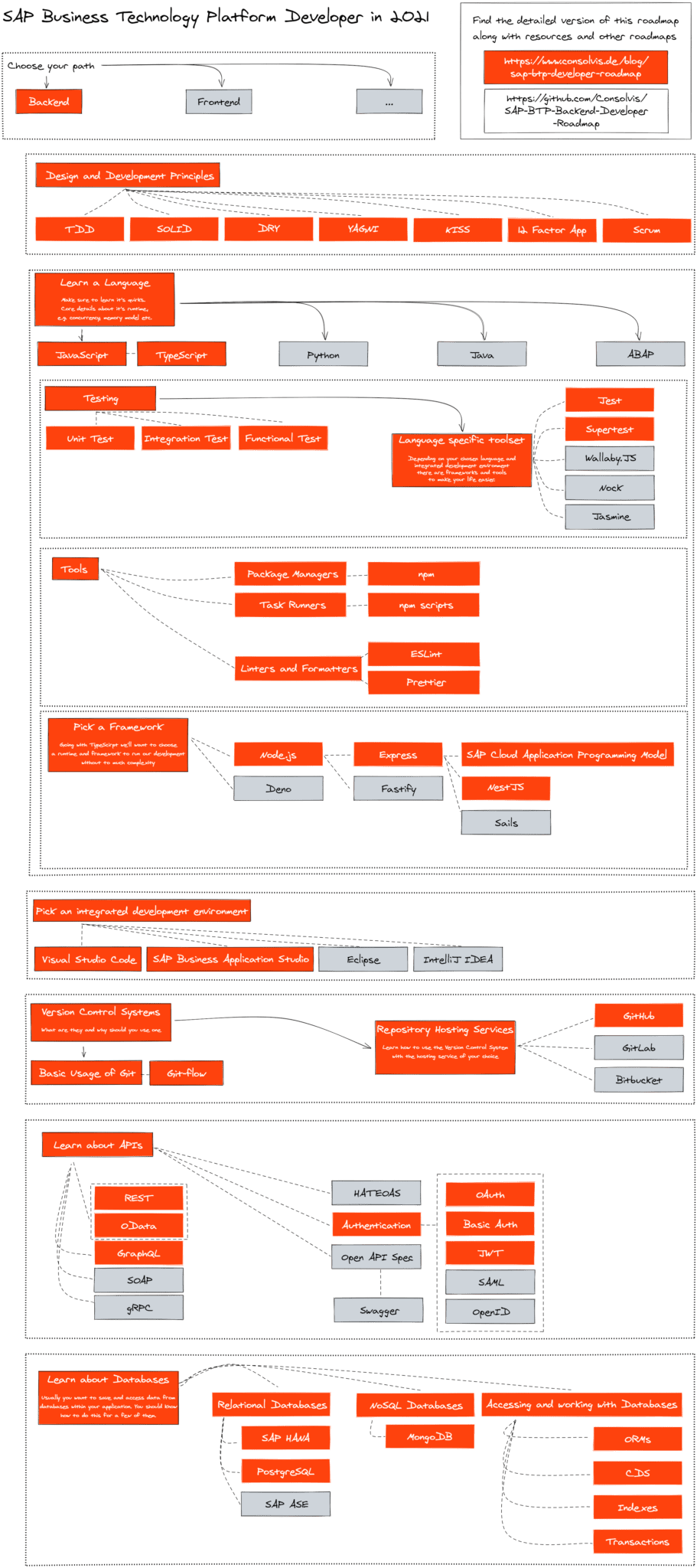 Dies ist meine persönliche Empfehlung. Sie konzentriert sich auf JavaScript / TypeScript und auf die Cloud Foundry Umgebung der ehemaligen SAP Cloud Platform.